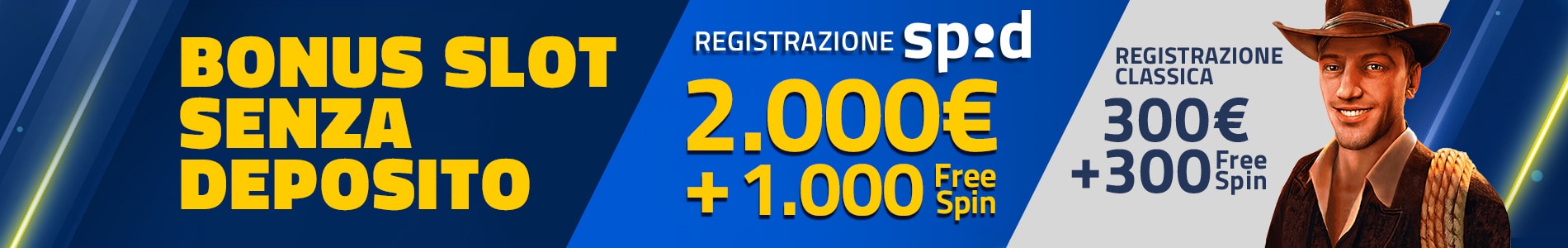 Certo, se scegli di accedere tramite Spid avrai accesso a un Bonus registrazione da 2000€ + 1000 Free Spins dopo aver completato la registrazione sul nostro casino. Se invece, scegli di accedere tramite registrazione classica si avrà subito diritto ad un bonus di 300€ per provare tutti i nostri giochi da casino e 300 free spin.