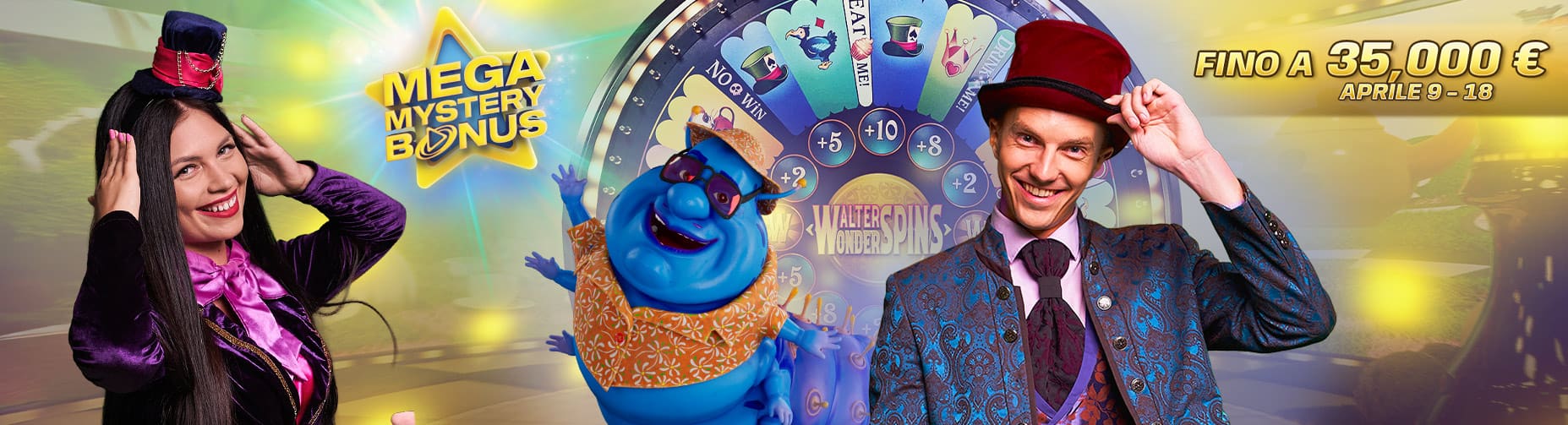 - Il Mega Mystery Bonus sarà attivo su: Adventures Beyond Wonderland Live, Mega Fire Blaze Roulette Live, Mega Fire Blaze Lucky Ball Live.