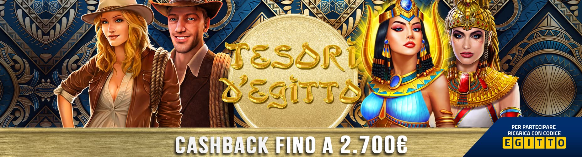 - Per partecipare alla presente iniziativa promozionale e ricevere il cashback sugli importi giocati e sugli importi eventualmente persi, come specificato nella tabella presente su questa pagina, è necessario ricaricare con codice promozionale EGITTO e giocare alle slot partecipanti entro la fine della promozione.